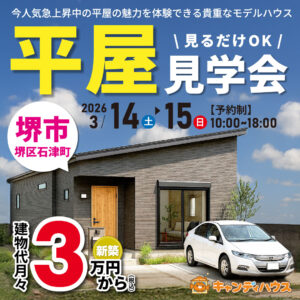2026年3月14日(土),15日(日) 堺市堺区石津町 平屋モデルハウスグランドオープン!! ※要予約